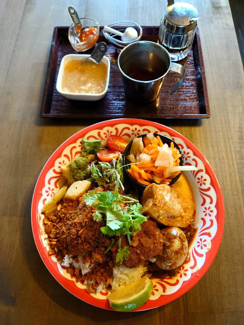 ランチは、アジアの料理をチキンで炊いたジャスミンライスの上にのせて、混ぜながらいただく、「皿めし」スタイル。