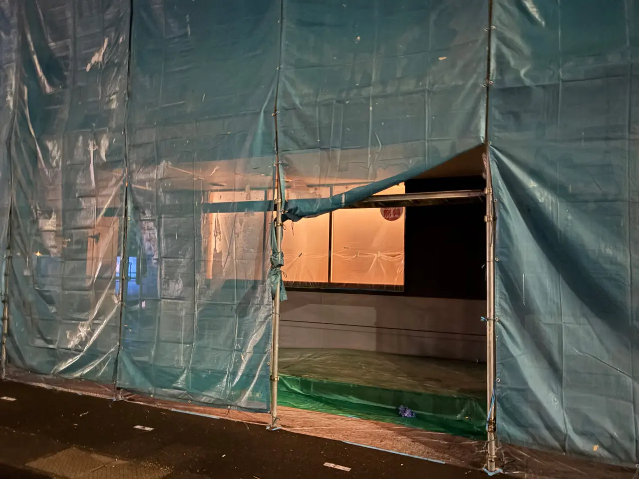 足場やブルーシートが設置され、外装仕上げと内装工事が同時進行中のようでした。