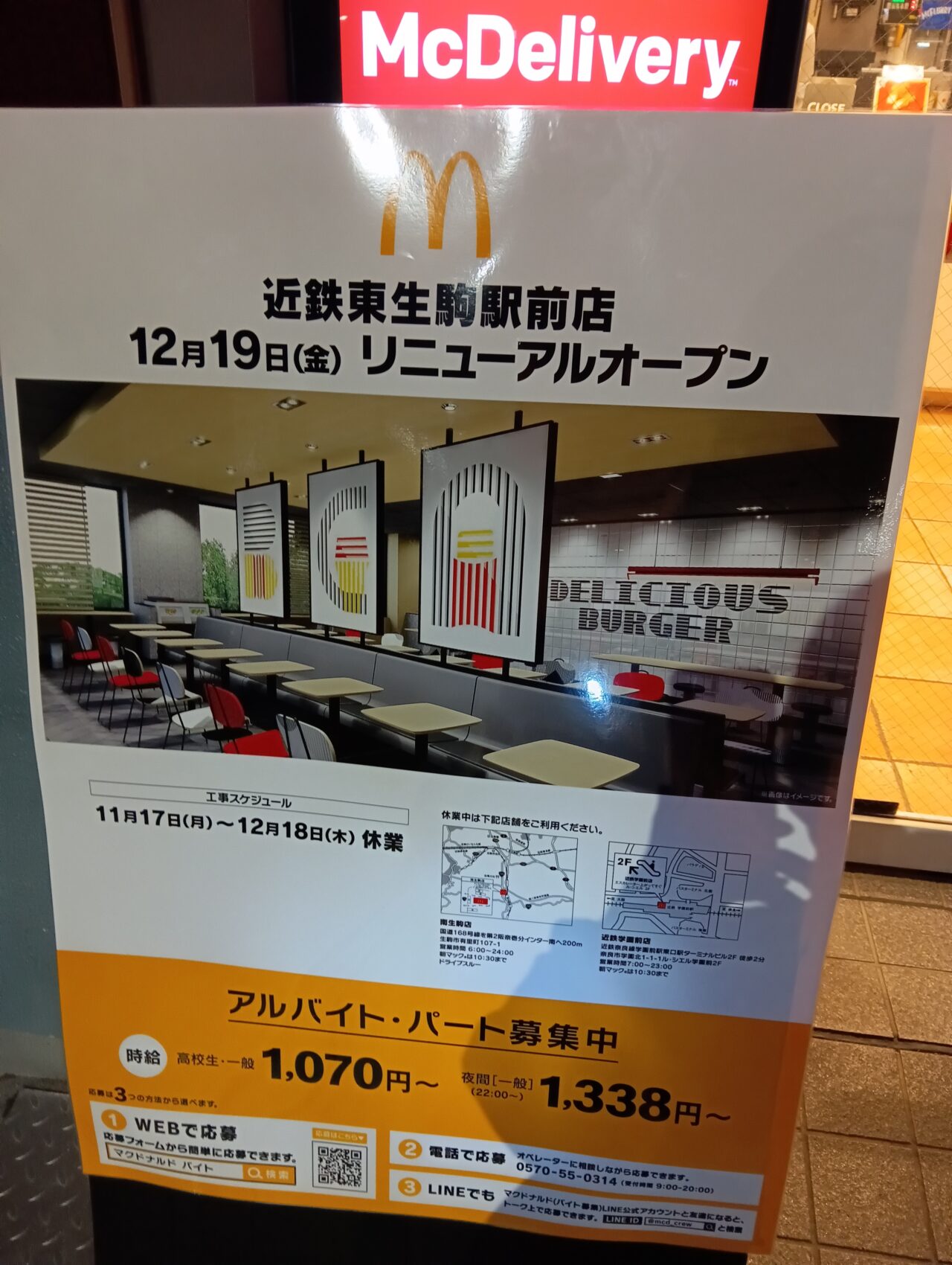 マクドナルド近鉄東生駒駅前店が2025年11月17日(月)より一時閉店するとのこと。