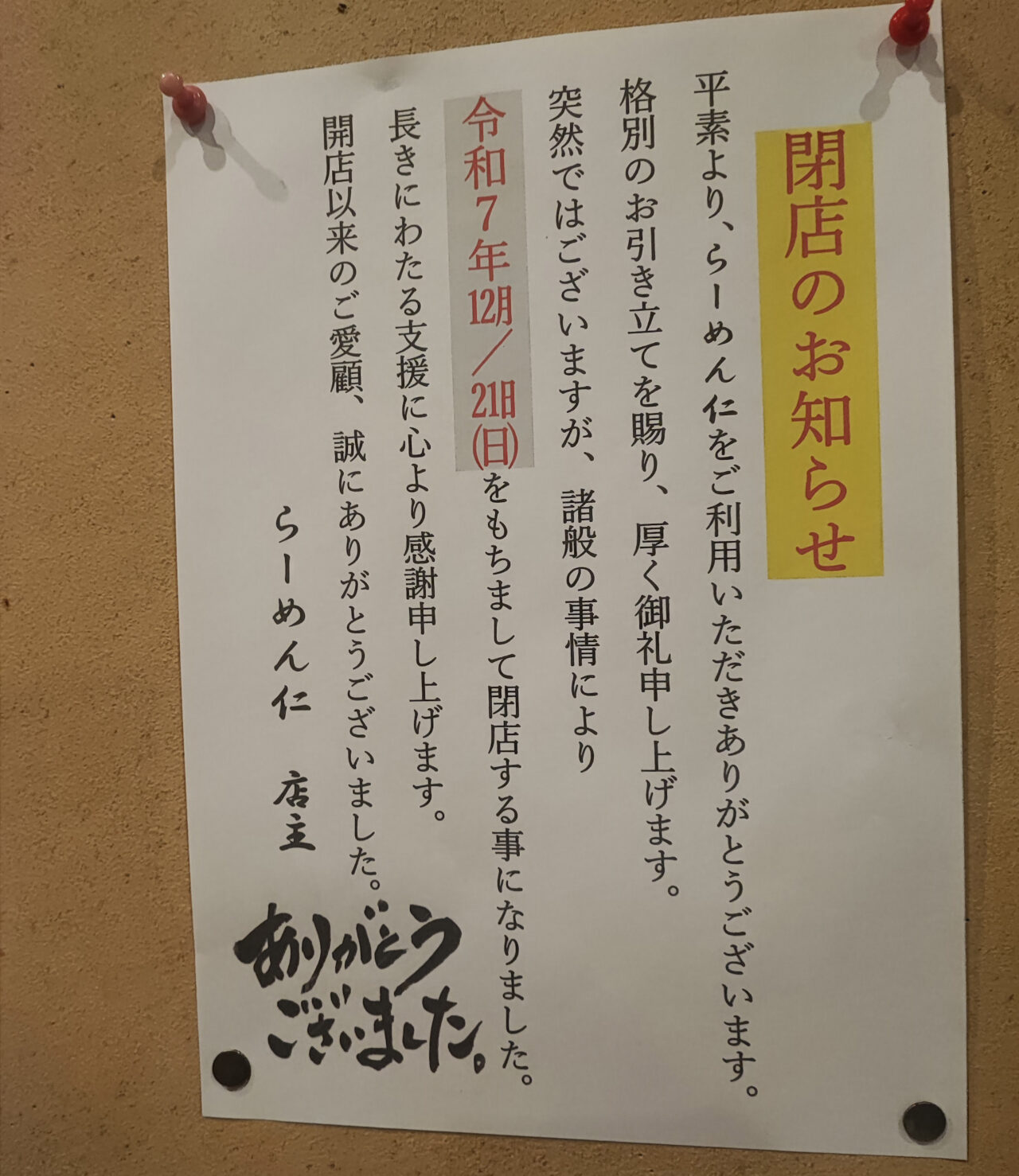 六条二丁目にあるラーメン店「らーめん 仁」が閉店するとの情報提供をいただききました。