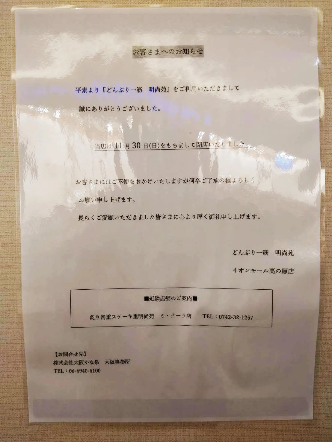 【奈良市】イオンモール高の原、4Fフードコート内にあった店舗が閉店しました。