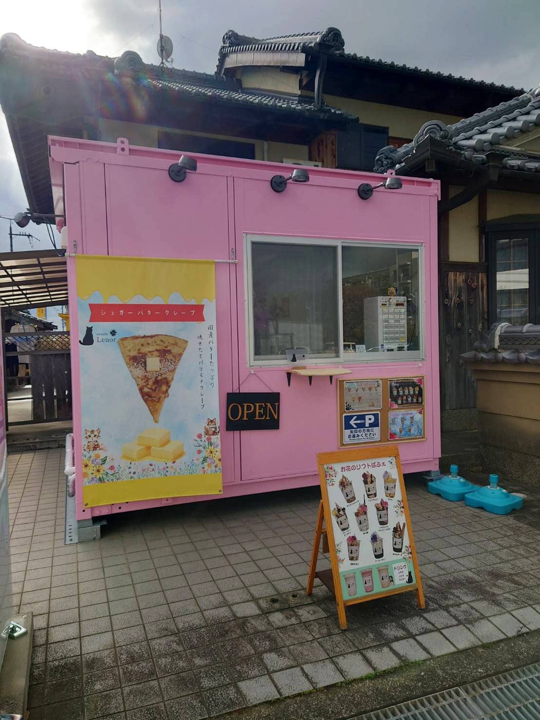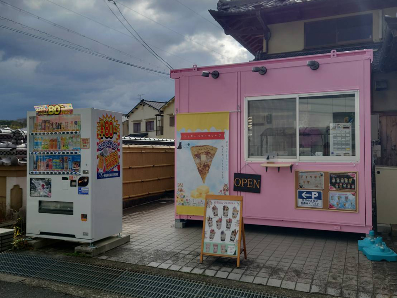 住宅街にピンク色の外観の店舗は映えますね。