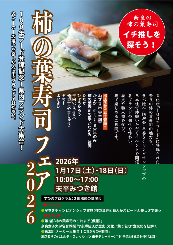 2026年1月17日(土)、18日(日)に、平城宮跡歴史公園 天平みつき館にて「柿の葉寿司フェア 2026」が開催されますよ!