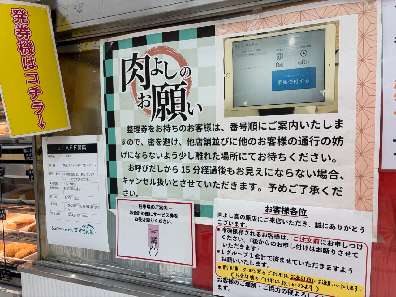 こちらのお店では、混雑を避けるために「順番待ち受付機」が導入されています。番号券を受け取ってから、館内で他のお買い物を済ませることもできるので、待ち時間も有効に使えますね。