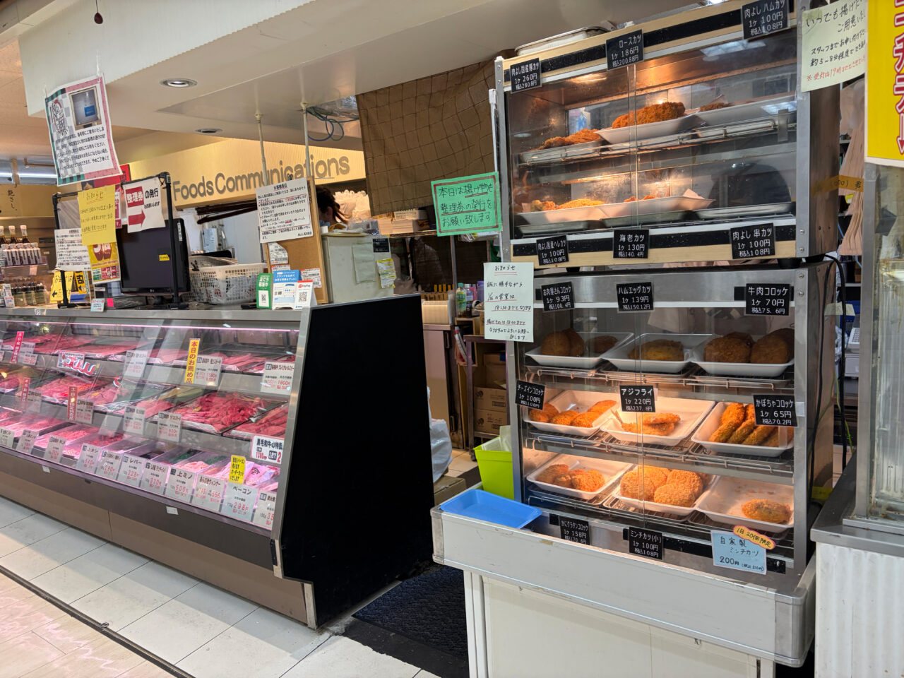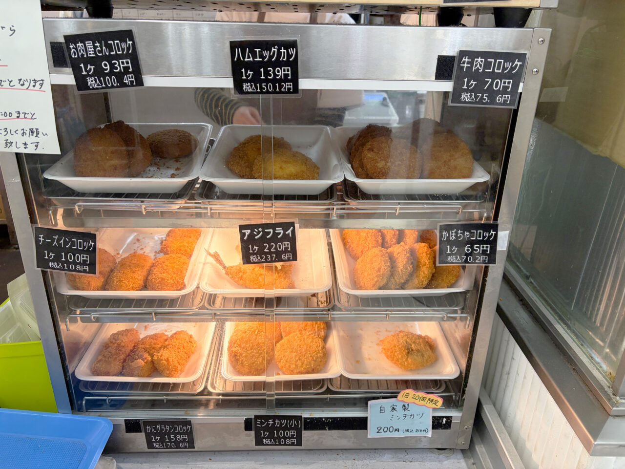 店頭にショーケースがあり、揚げ物メニューが並んでいます。