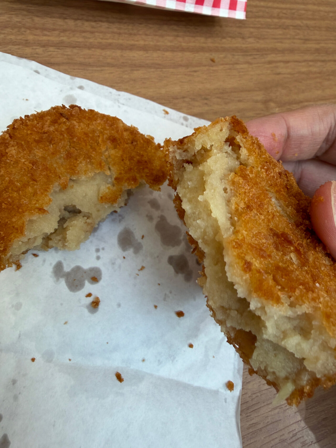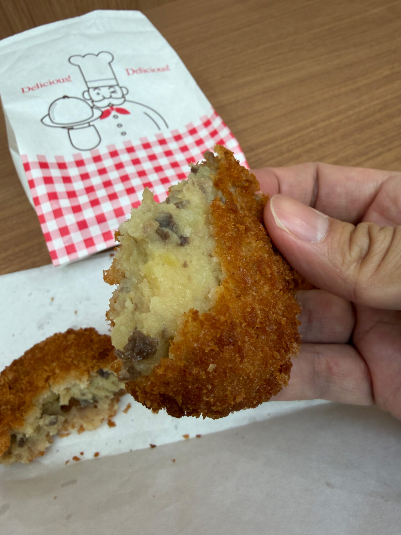 一方、お肉屋さんコロッケ(100.4円)は、1.5倍ほどの大きさで、中に入っている挽肉の存在感が抜群。