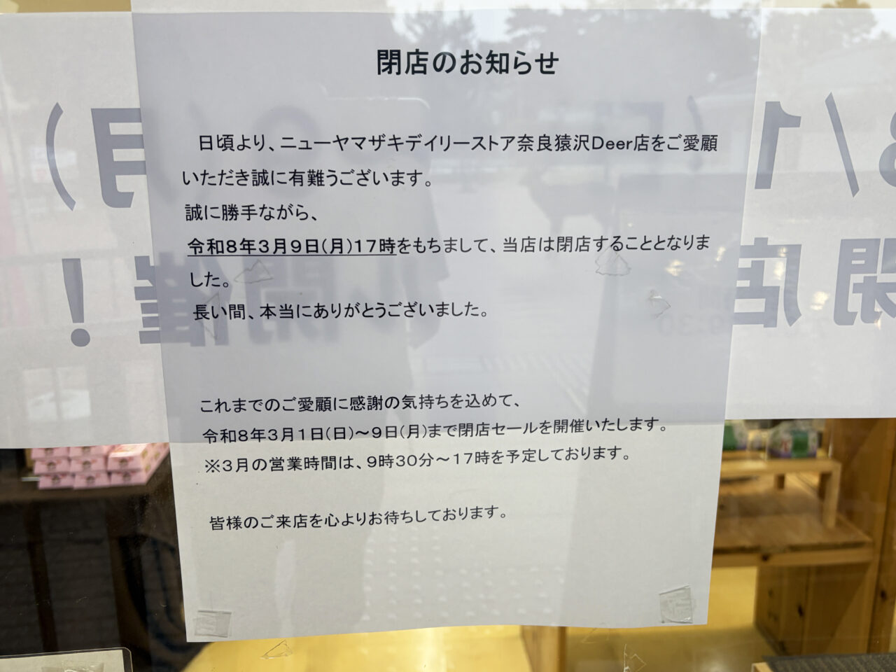 奈良市内観光のシンボルの一つである「猿沢池」のすぐ南側にあるコンビニ、「ニューヤマザキデイリーストア 奈良猿沢Deer店」にて、閉店セールが開催されるようです。