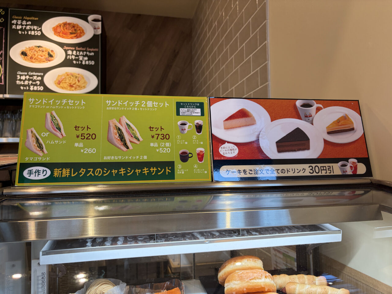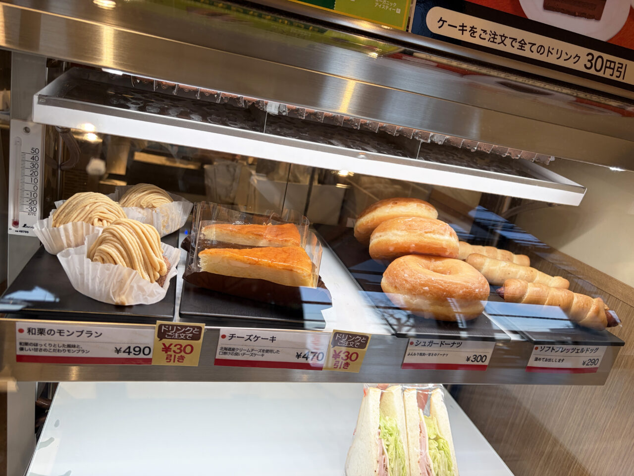 ショーケースには、和栗のモンブラン(490円)、チーズケーキ(470円)、シュガードーナツ(300円)などが並び、ドリンクと一緒に注文すると30円引きになるサービスも。