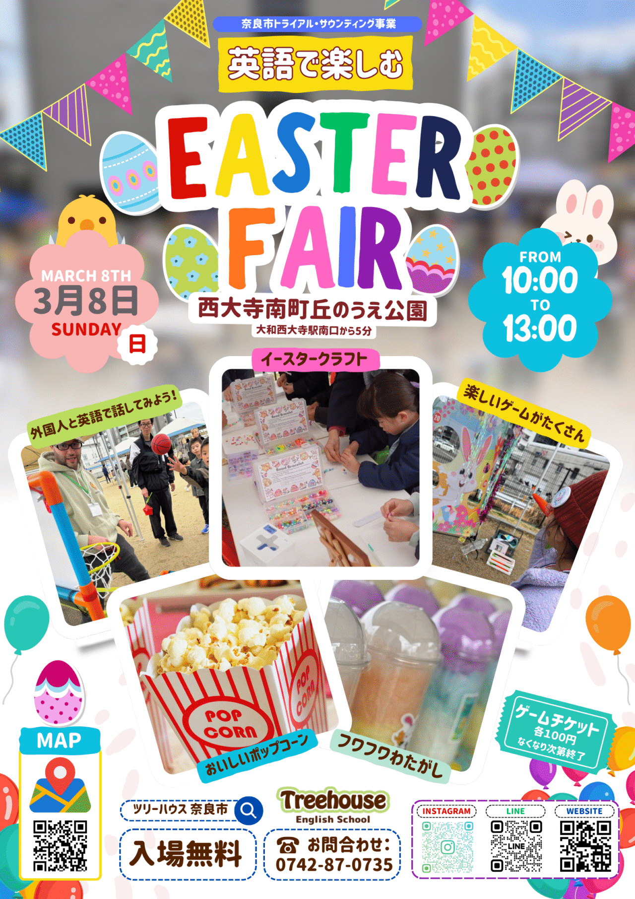 2026年3月8日(日)に、大和西大寺駅南側にある西大寺南町丘のうえ公園にて、子ども向けイベント「英語で楽しむイースターフェア(EASTER FAIR)」が開催されます。