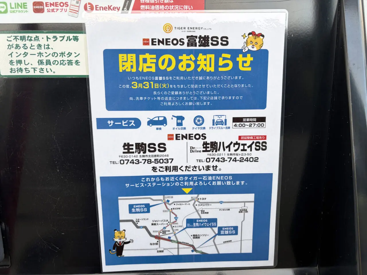 大阪方面側にある、ガソリンスタンド「ENEOS 富雄SS」が閉店するとの情報が入ってきました。