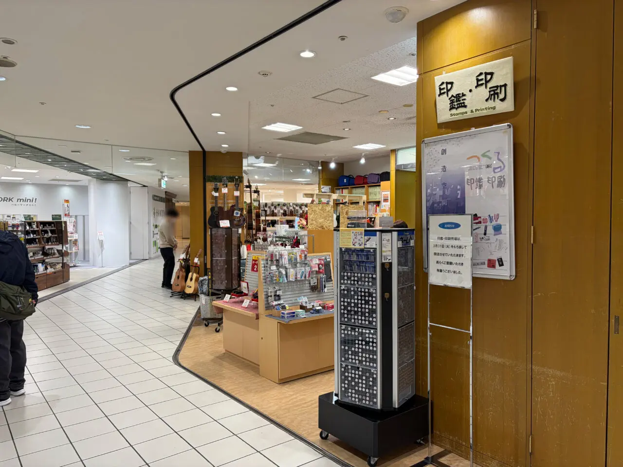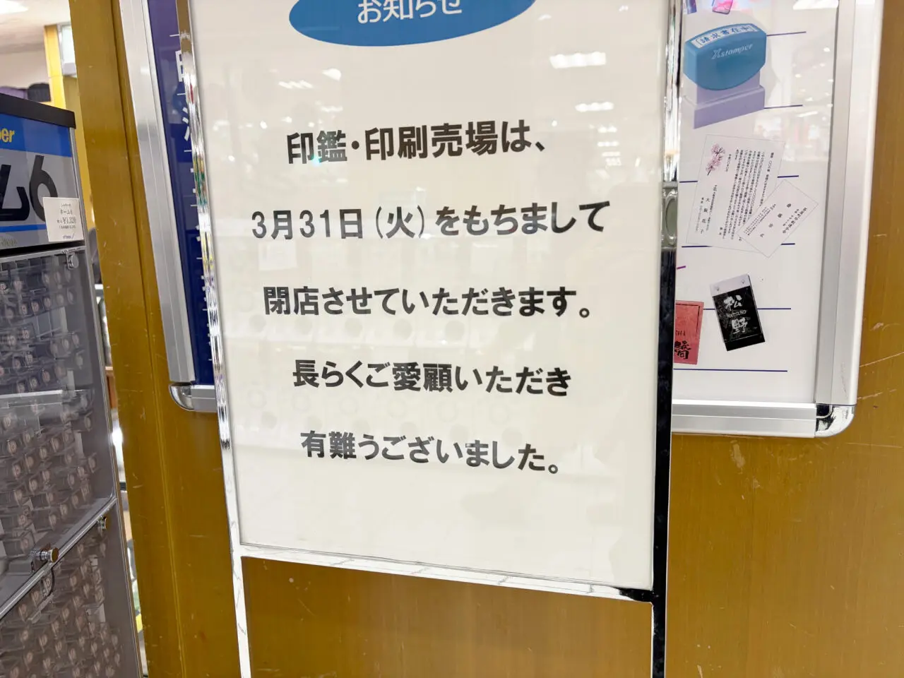 店頭には「印鑑・印刷売場は、3月31日(火)をもちまして閉店させていただきます」とのお知らせが掲示されており、長年の営業に対する感謝の言葉も添えられていました。