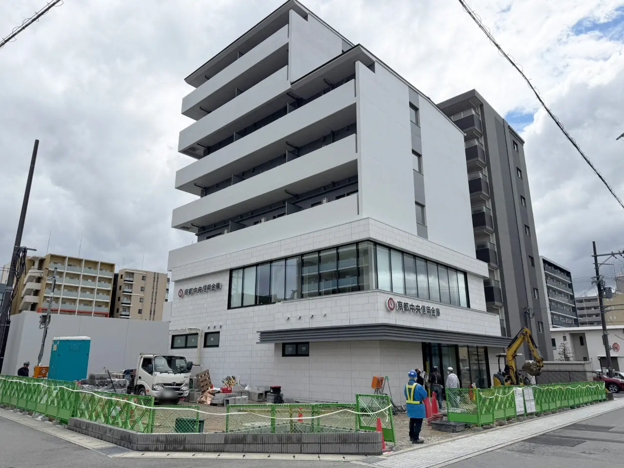 現地では昨年から工事が続いていましたが、防音シートが外され、白を基調とした外観の建物が確認できるようになっています。建物には「京都中央信用金庫」の看板が設置されており、新たな支店として開業予定です。