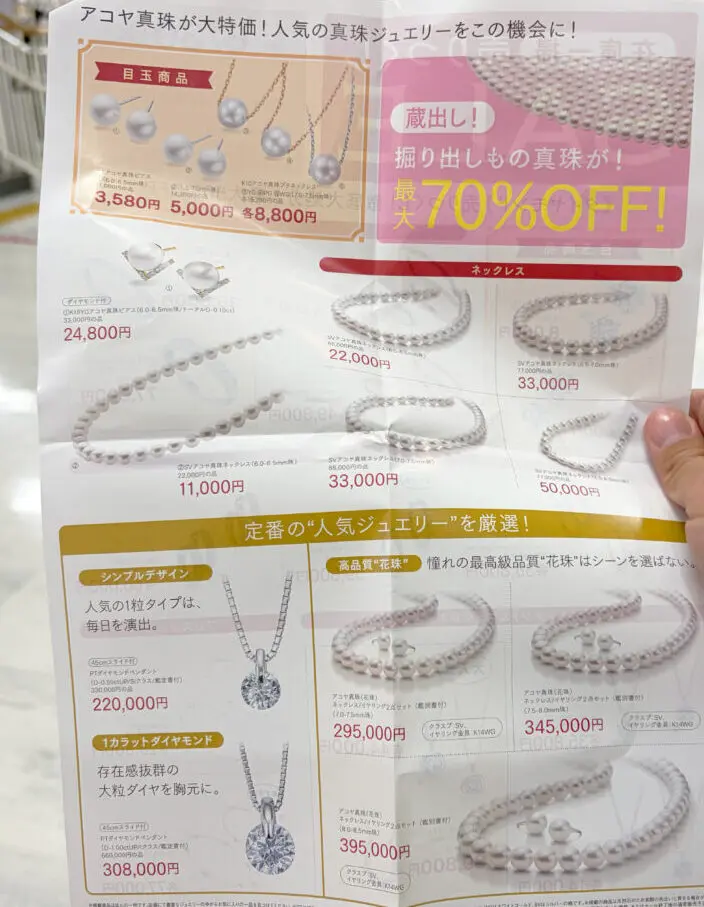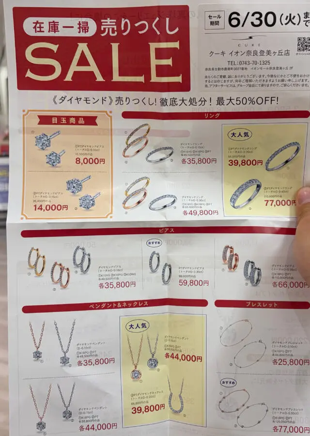 店頭ではすでに「完全閉店SALE」が掲示されており、在庫一掃の売りつくしセールが実施されています。チラシによると、ダイヤモンド商品は最大50%OFFとなっており、ピアスやリング、ネックレスなど幅広い商品が対象です。