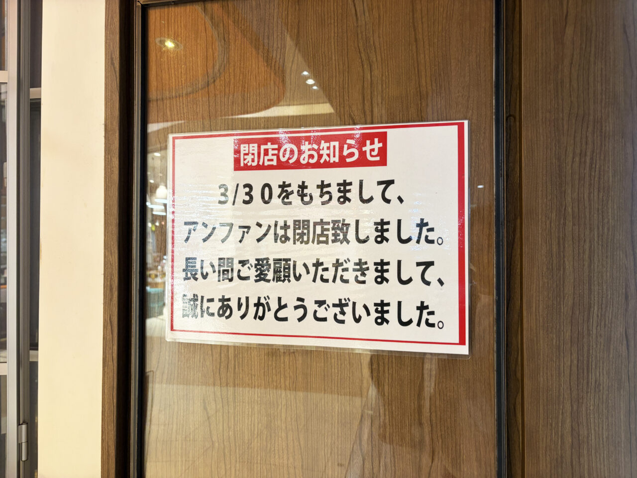 入口付近で営業をされていた、「アンファン 近鉄大和西大寺駅店」が閉店していました。