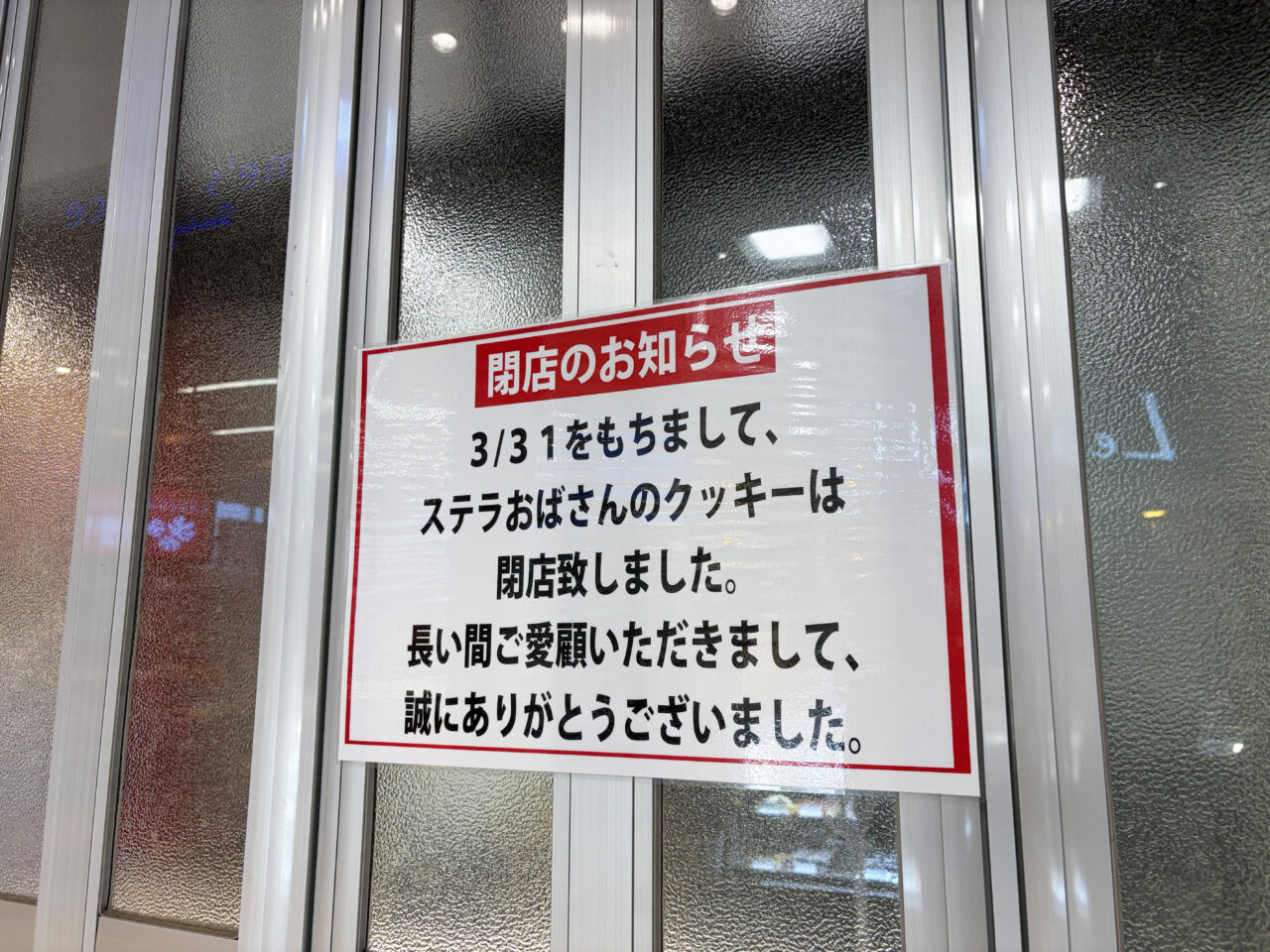 さらに、「ステラおばさんのクッキー タイムズプレイス西大寺店」も閉店していました。同じく2026年3月31日をもって閉店したそうです。